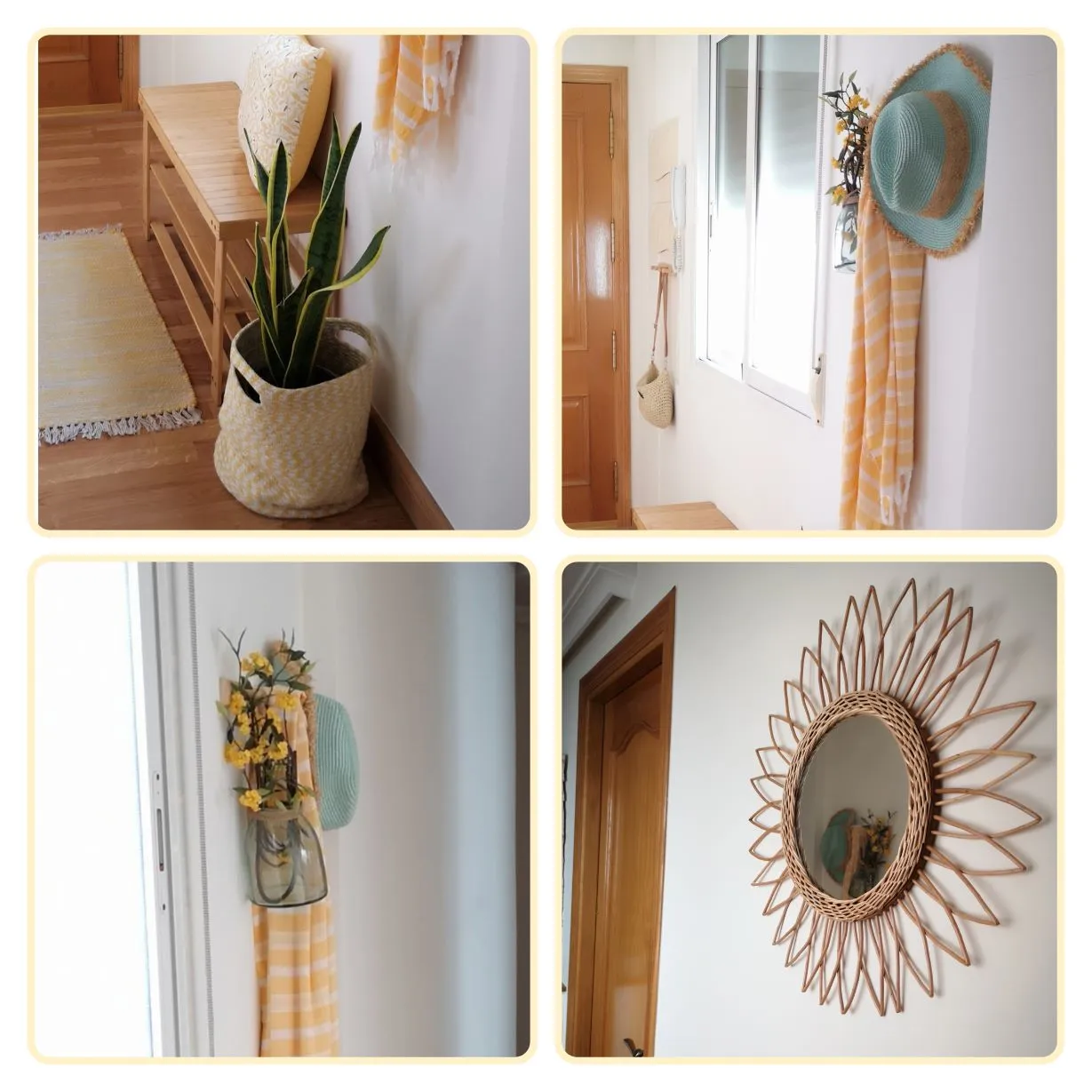 Aquí he optado por un espejo sol de mimbre en la pared de enfrete de la ventana, para reflejar la luz y al mismo tiempo, los detallitos del perchero con el sombrero y las flores amarillas.